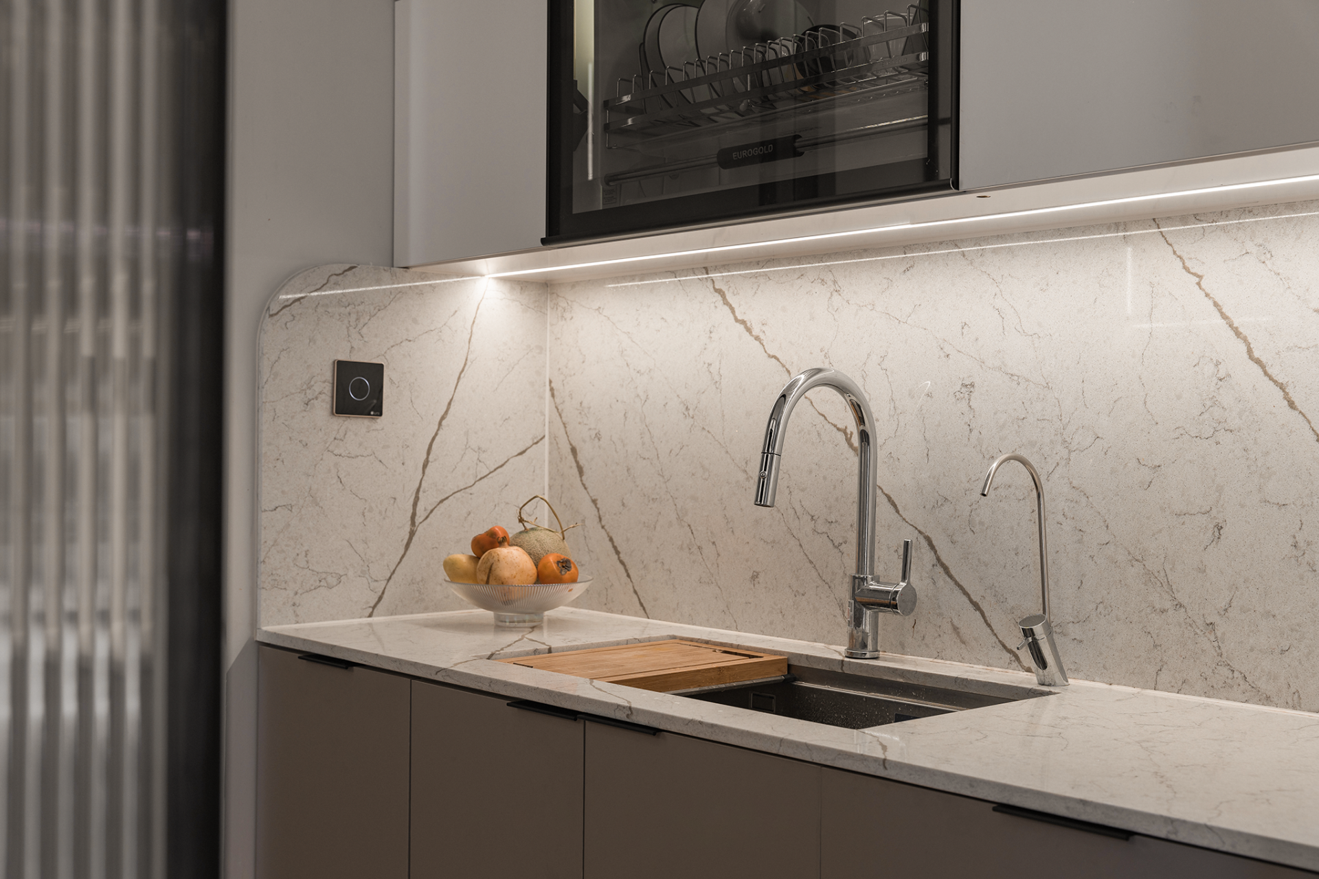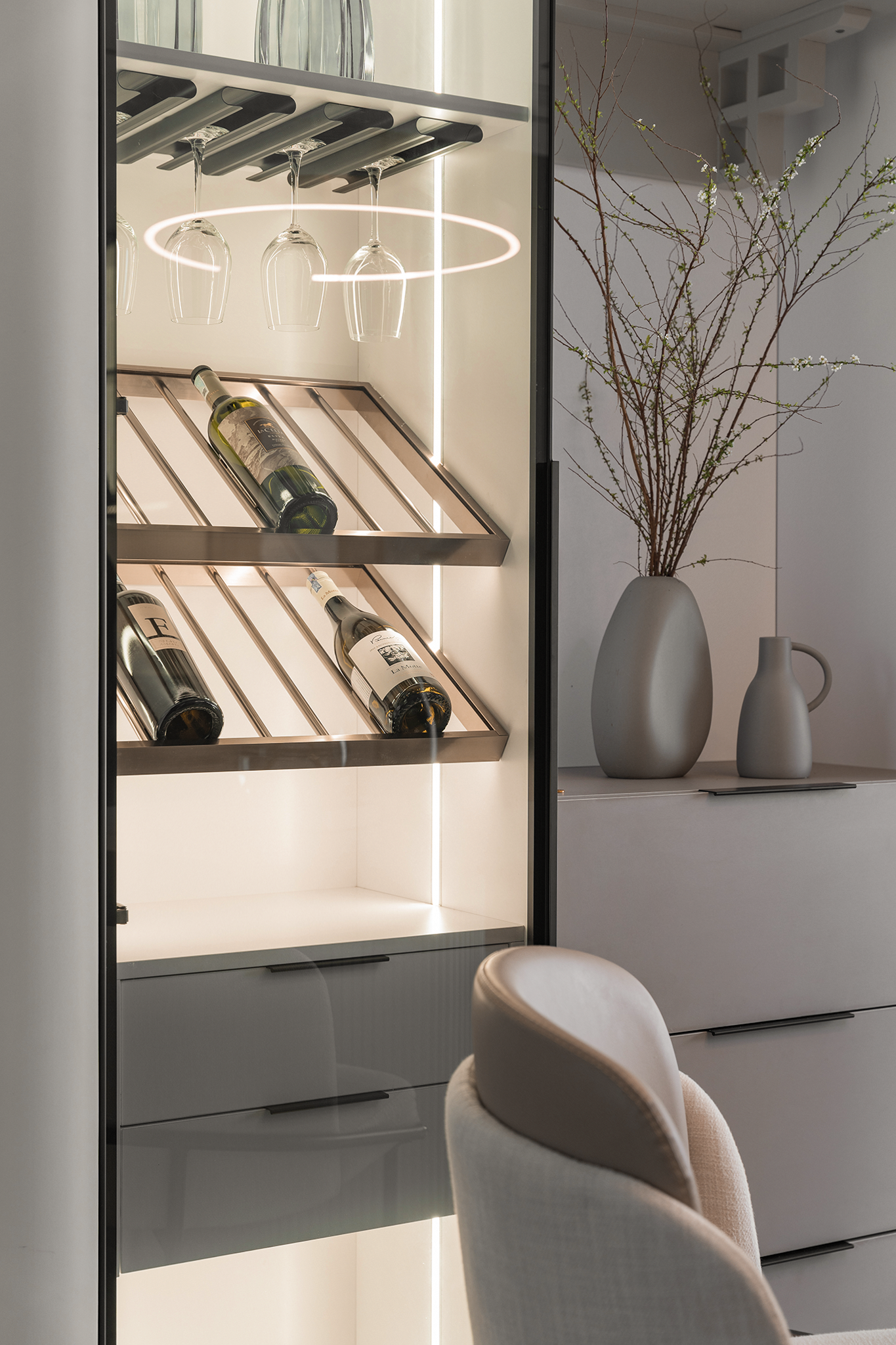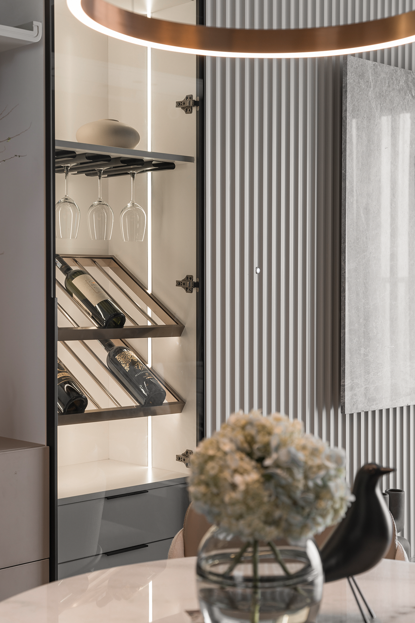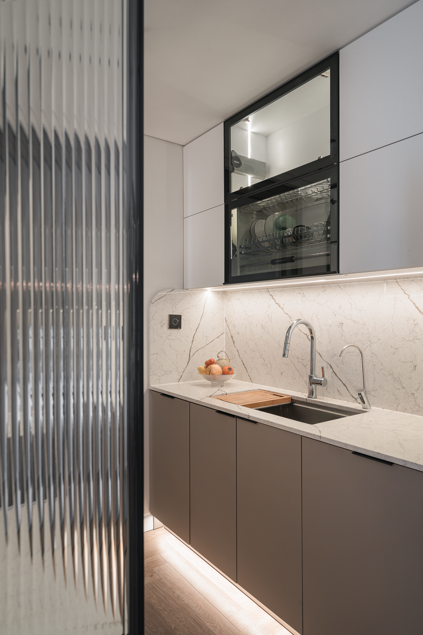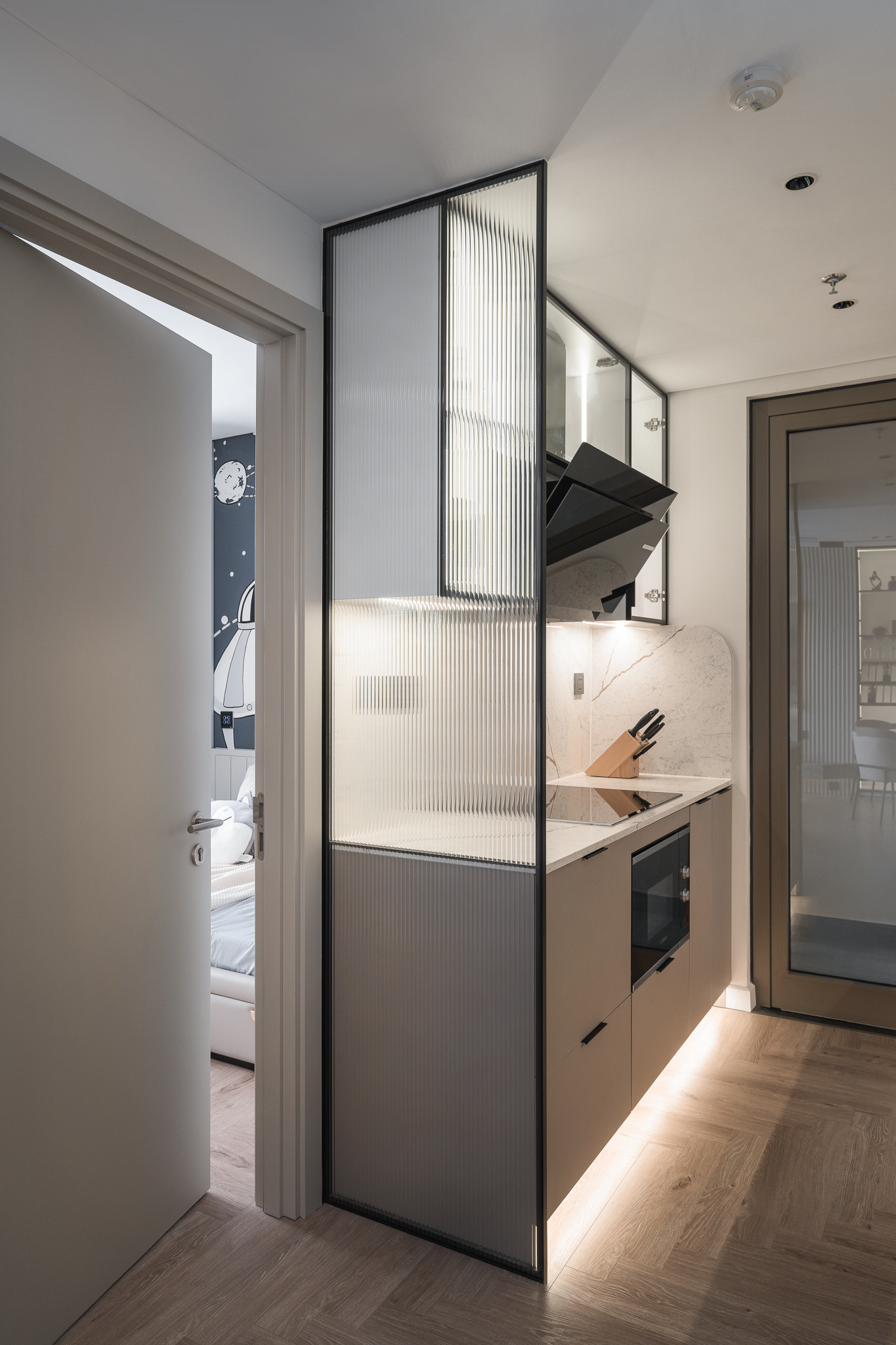 2、拆除廚房與餐廳之間的隔墻,增大廚房的使用面積,利用玻璃隔斷同時優(yōu)化采光。