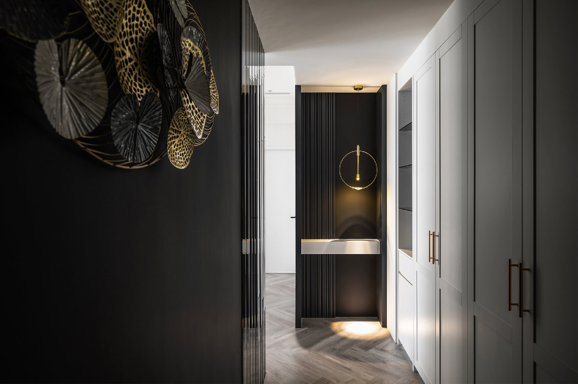 玄關(guān)處整體以簡(jiǎn)約為主基調(diào),布置大面積置物空間,打造“回家即解放”的輕松舒適感,站在玄關(guān),魚骨拼地板傾斜線條視覺上擴(kuò)大空間,放眼望去滿屋溫馨盡收眼底。