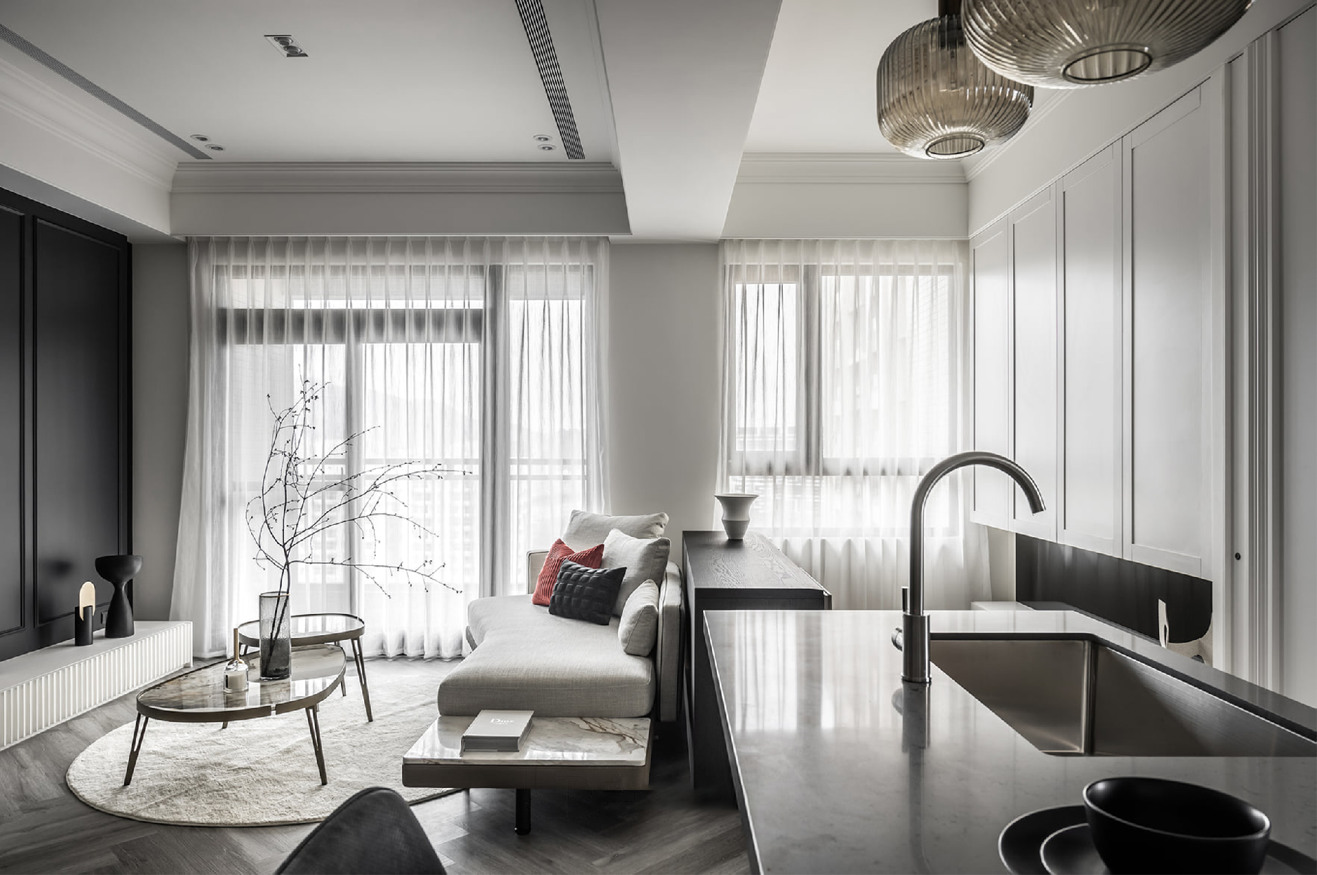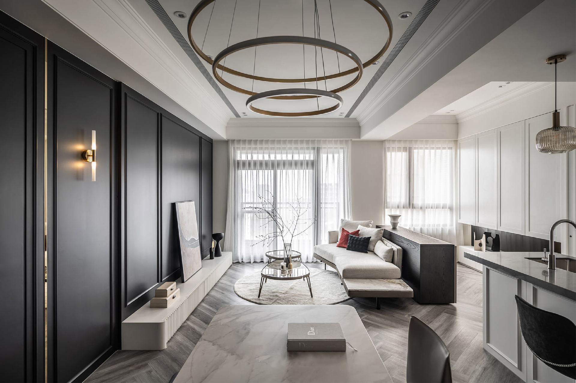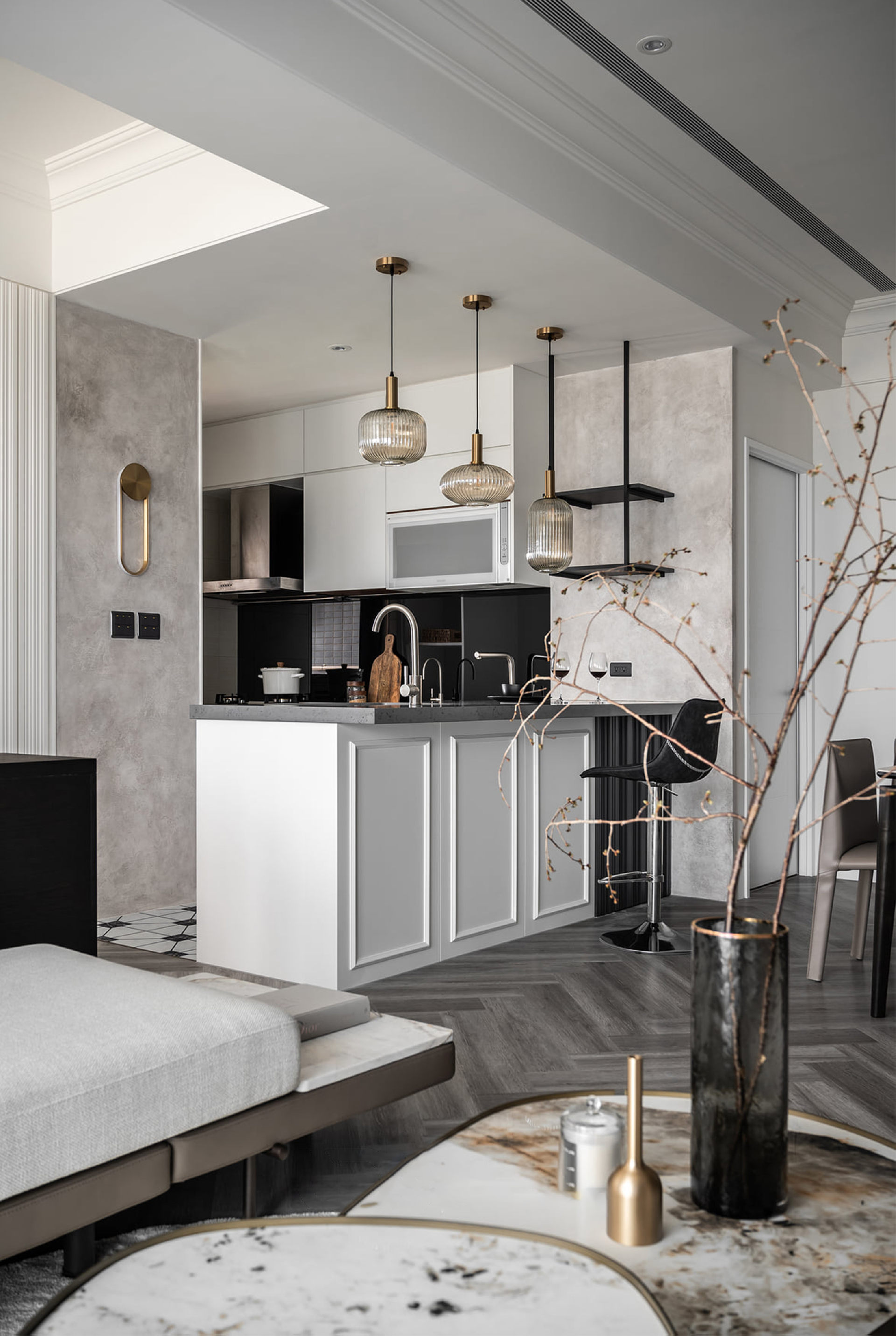吧臺(tái)風(fēng)島臺(tái)設(shè)計(jì)的L形開放式廚房做留白處理,經(jīng)典黑白風(fēng)搭配微水泥質(zhì)地墻面,混搭美學(xué)完美拿捏,三盞創(chuàng)意玻璃吊燈錯(cuò)落有致,精致而高級(jí)。