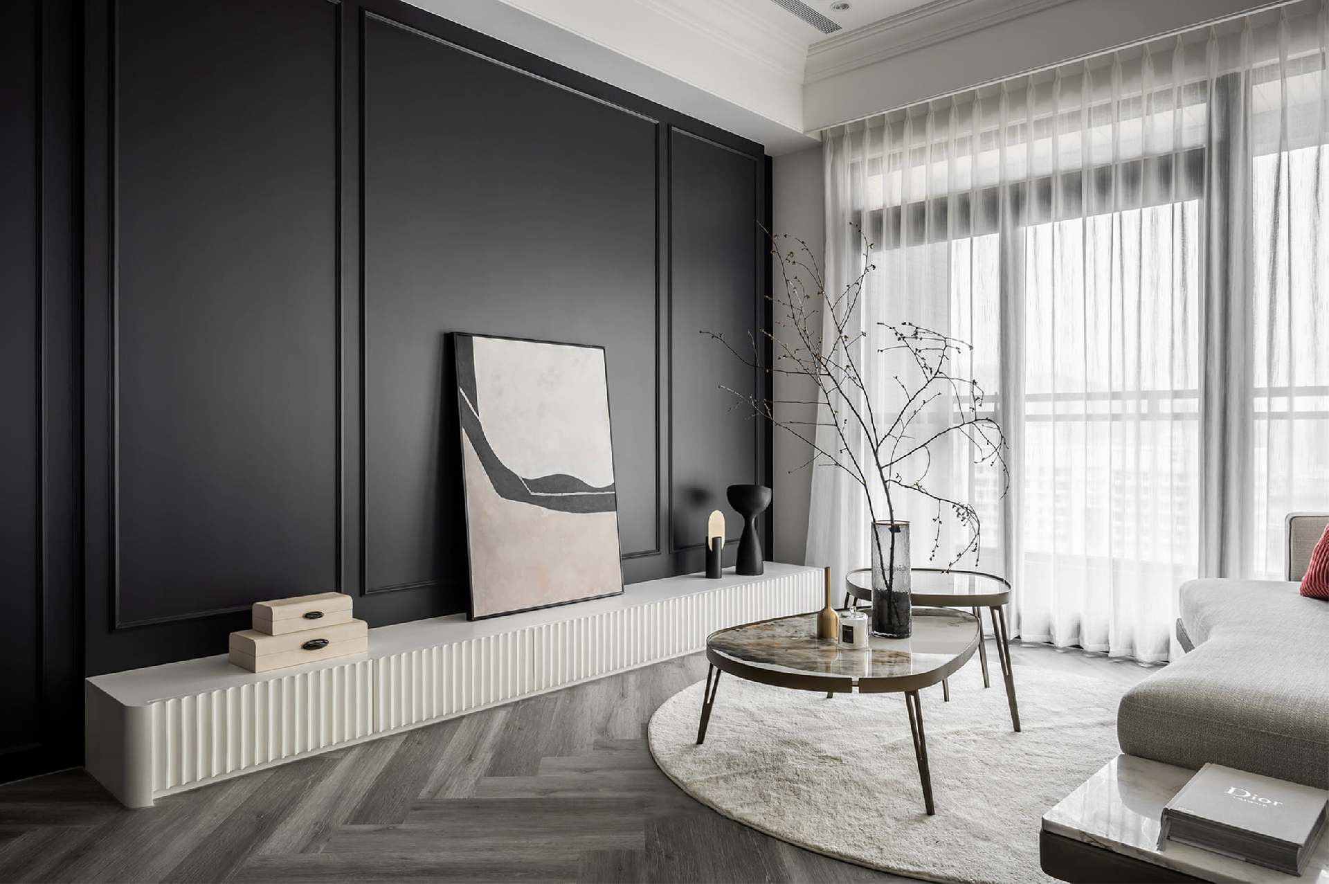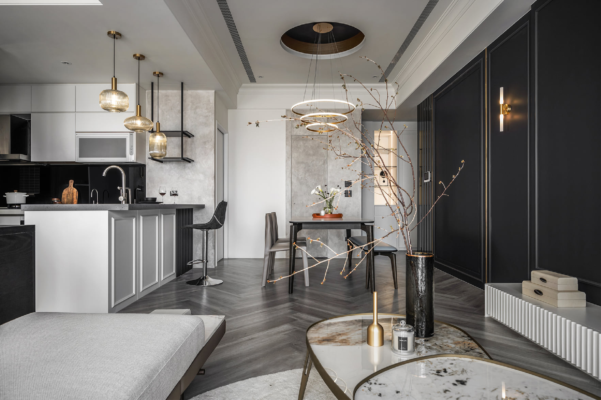 1. 經(jīng)典黑白灰搭配魚骨拼地板,奶白色北歐風(fēng)線條的融入將現(xiàn)代輕奢氛圍就此鋪排