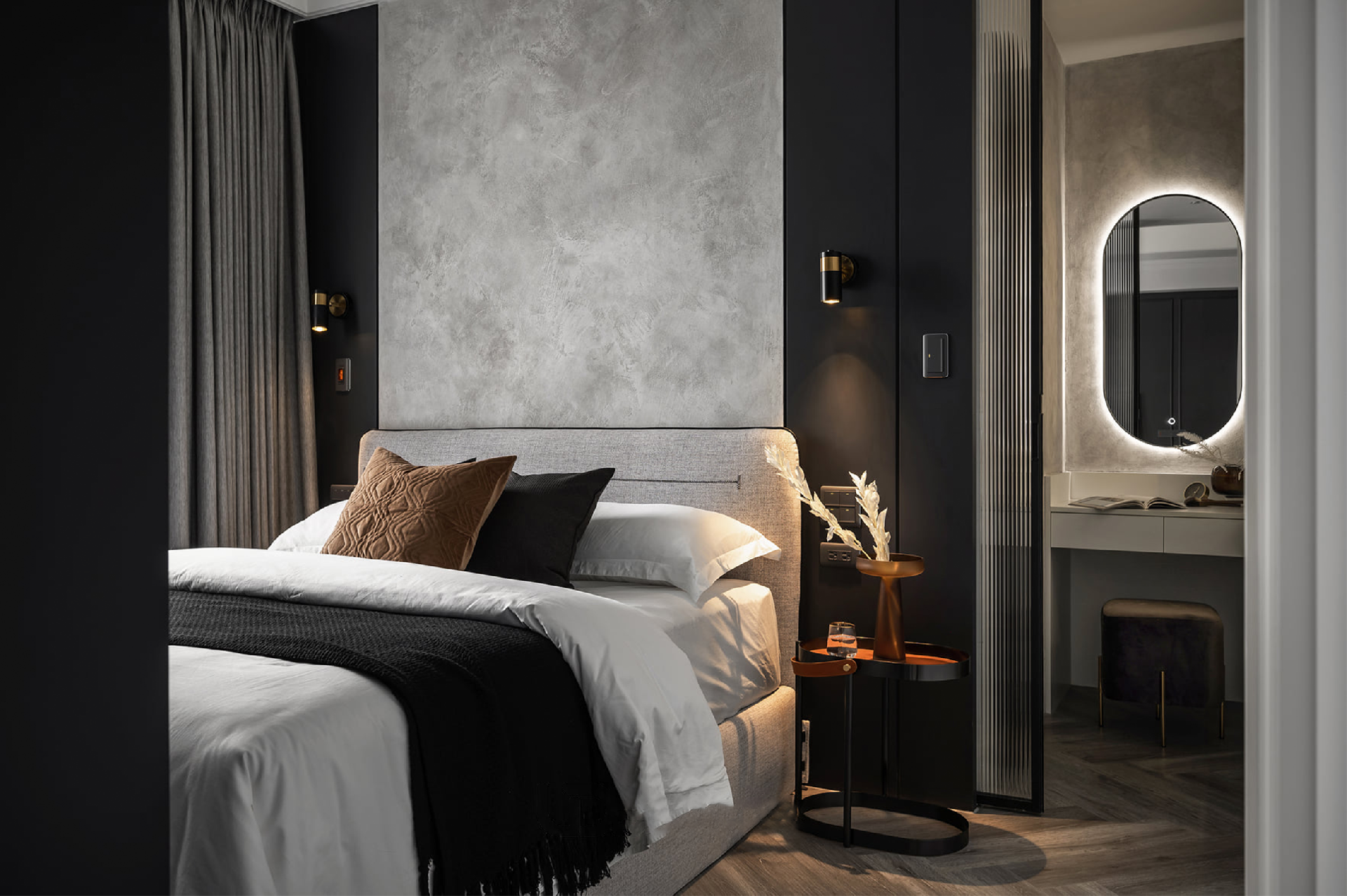 縱線條高挑大門打造開門見景的出其不意感,臥室內(nèi)簡(jiǎn)約雅致,大面積落地窗與滿墻收納櫥柜平行布置,體現(xiàn)對(duì)稱美學(xué),黑色長(zhǎng)虹玻璃門將衣帽間隔開,為屋主打造一個(gè)私藏小天地,發(fā)光鏡和回形收納隱藏式光源照亮女主人的美。