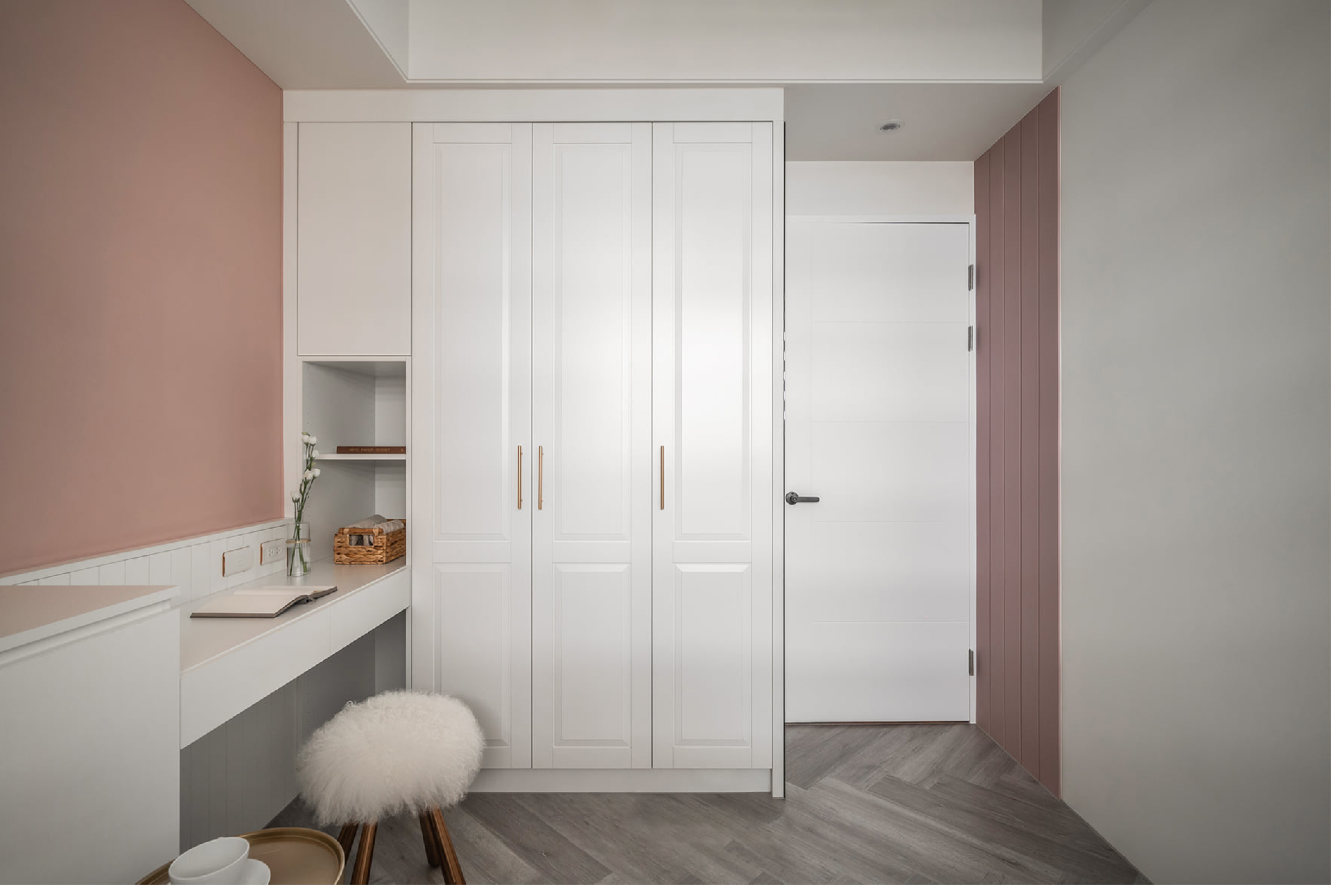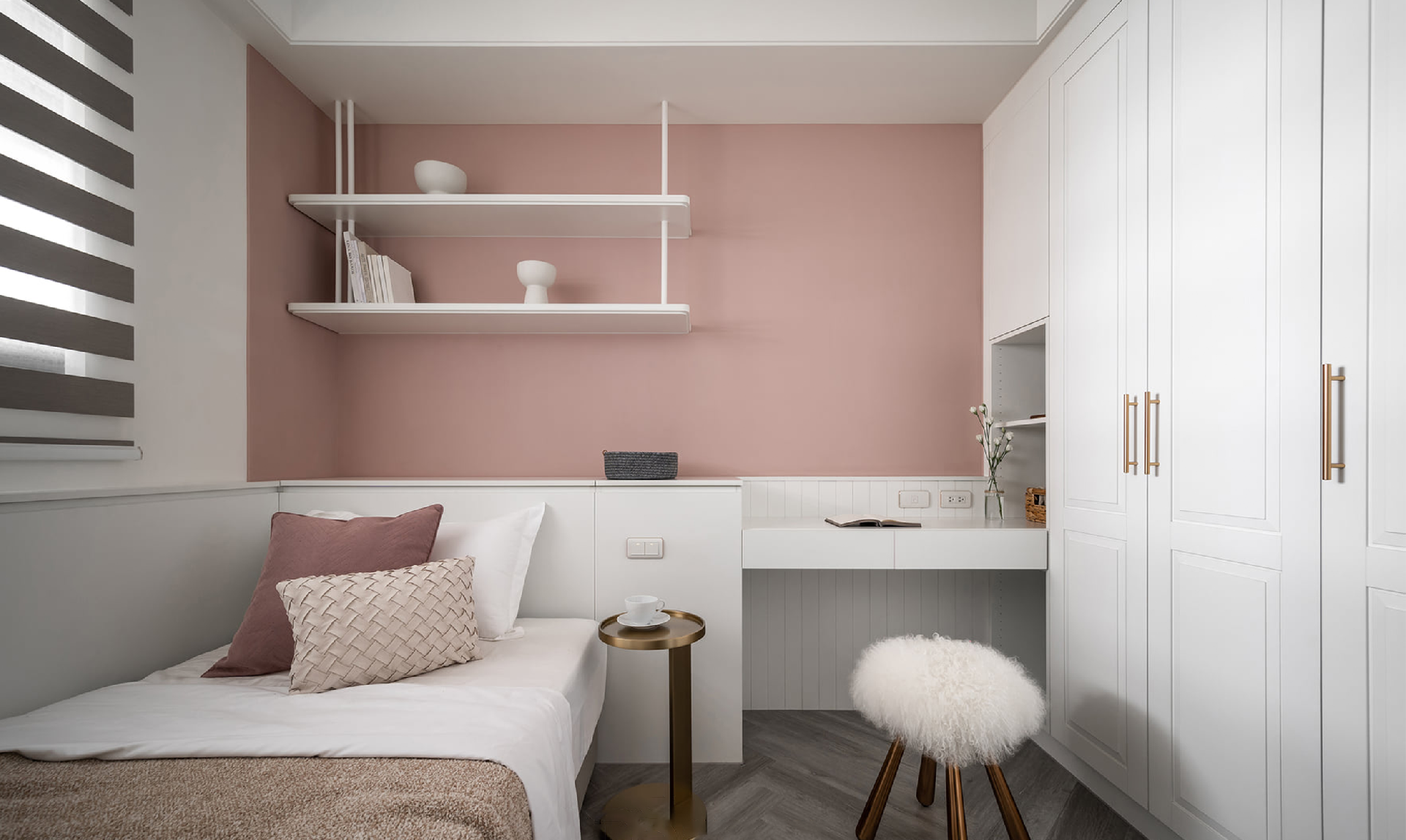 7. 次臥少女心撞色墻面+異形組合柜,兼具實(shí)用與美觀