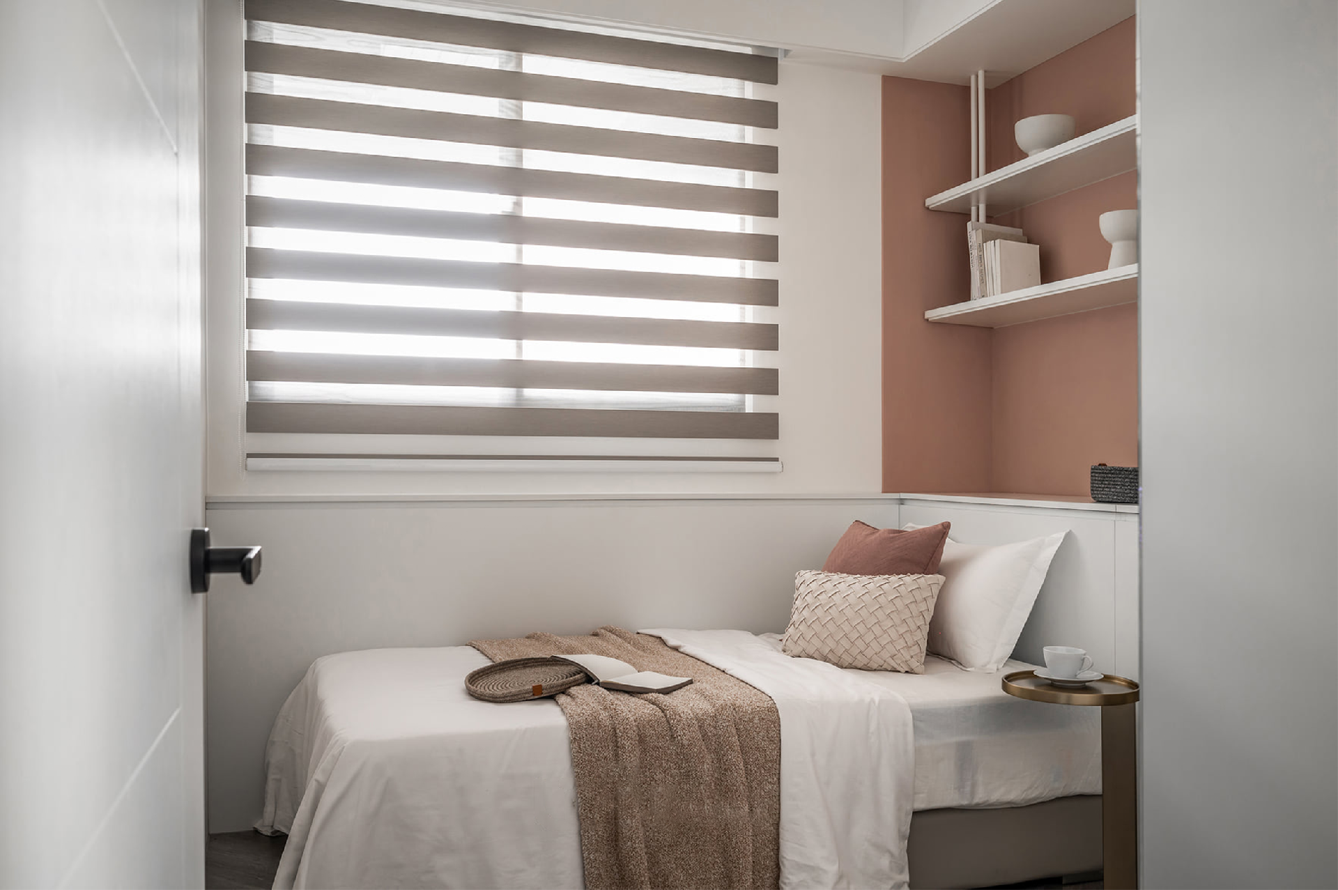 條紋窗簾遮光又溫暖,躺在床上也能感受光影變幻,大面積留白設(shè)計(jì)將室內(nèi)襯托的更加明亮通透,撞色回形凹面置物架拿取方便,打造無(wú)雜物空間,粉色墻面搭配溫柔奶白色異形立柜,延伸桌面將空間極致利用,淡雅寧?kù)o的氛圍非常適合在夏日午后獨(dú)坐桌前閱讀提升。