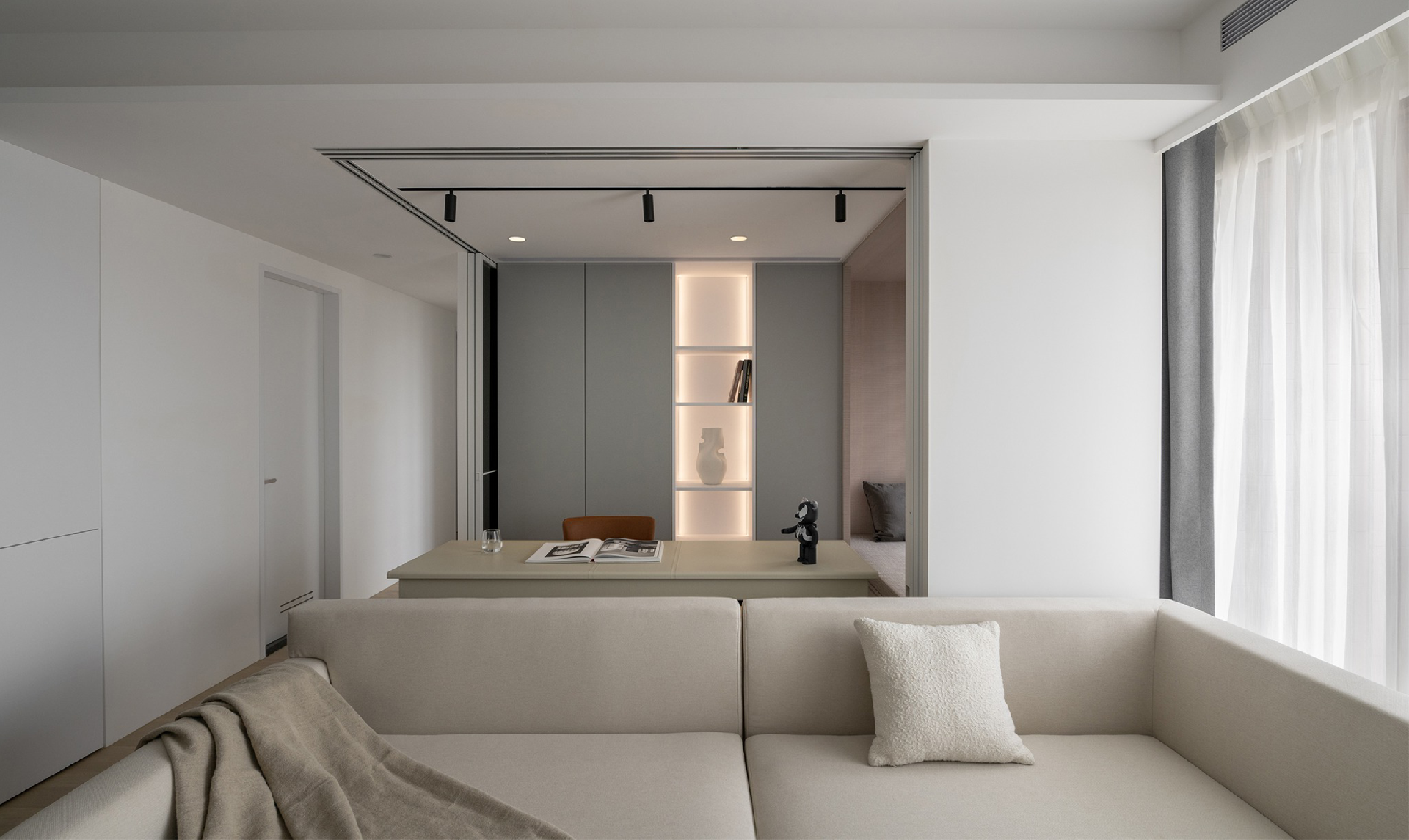 書房空間設立在沙發(fā)背景墻后方,原本是一個小次臥,后將墻體拆除,共享空間采光。根據(jù)屋主的需求,設計師采用玻璃門為空間隔斷,在日常需要辦公時,可以拉上門窗,以此保證空間的安靜性和獨立感。日常不使用時可以將玻璃門拉開,視覺上擴大客廳空間感,減少擁擠性。書房內部的墻體采用通頂收納柜定制,既能保證空間的儲物需求,又能將空間合理化的運用,提升空間的利用率。