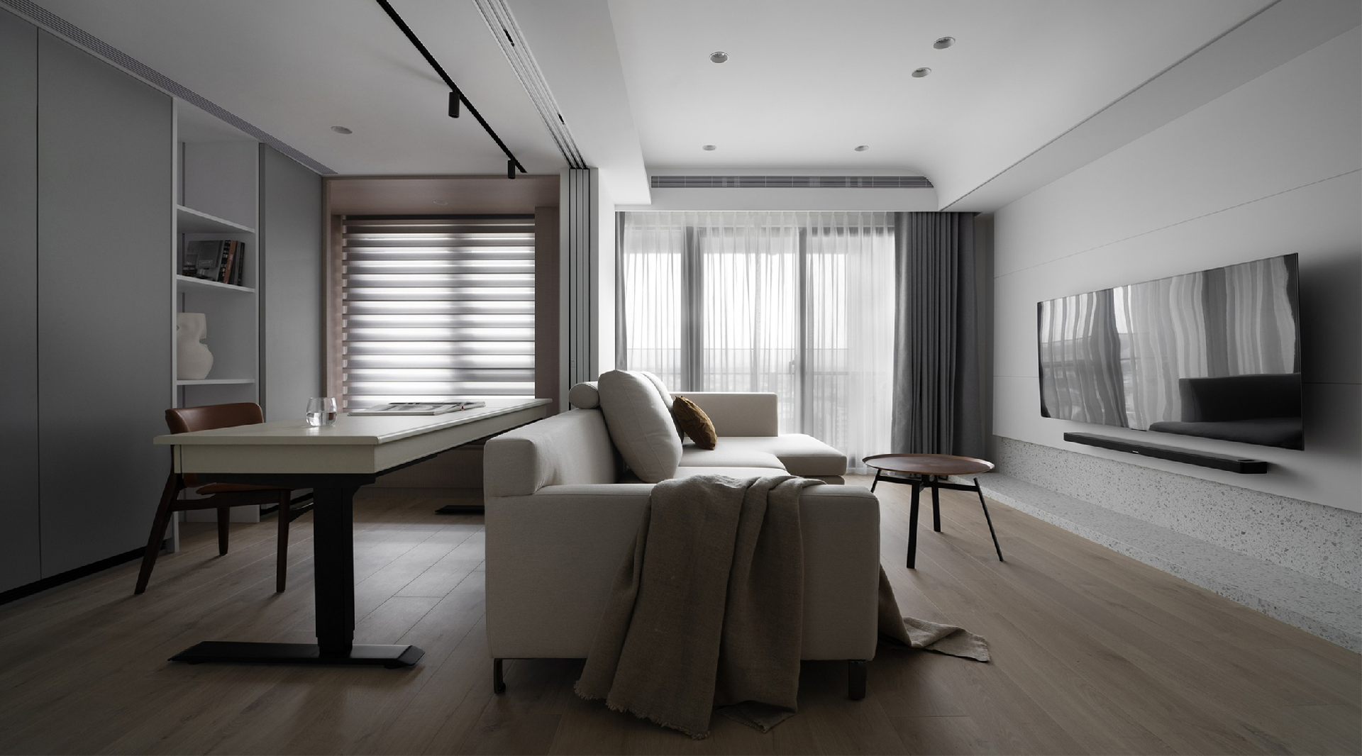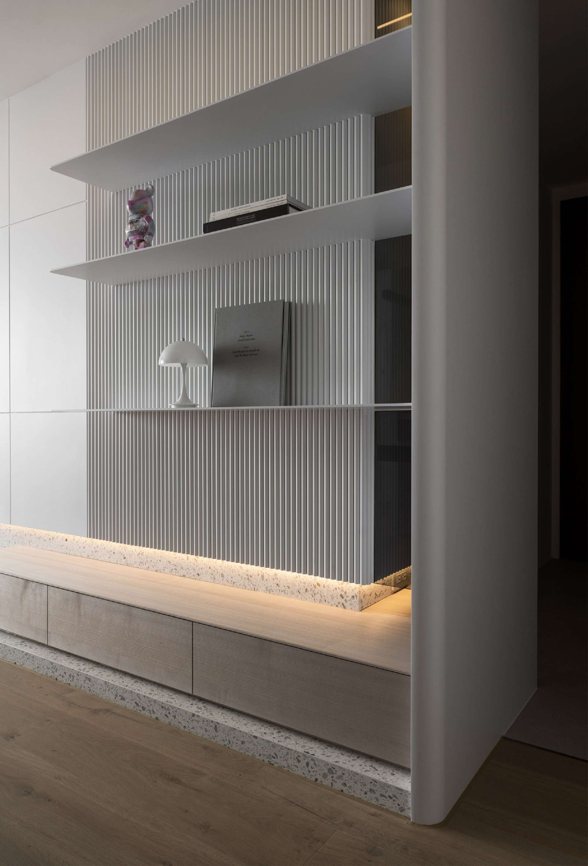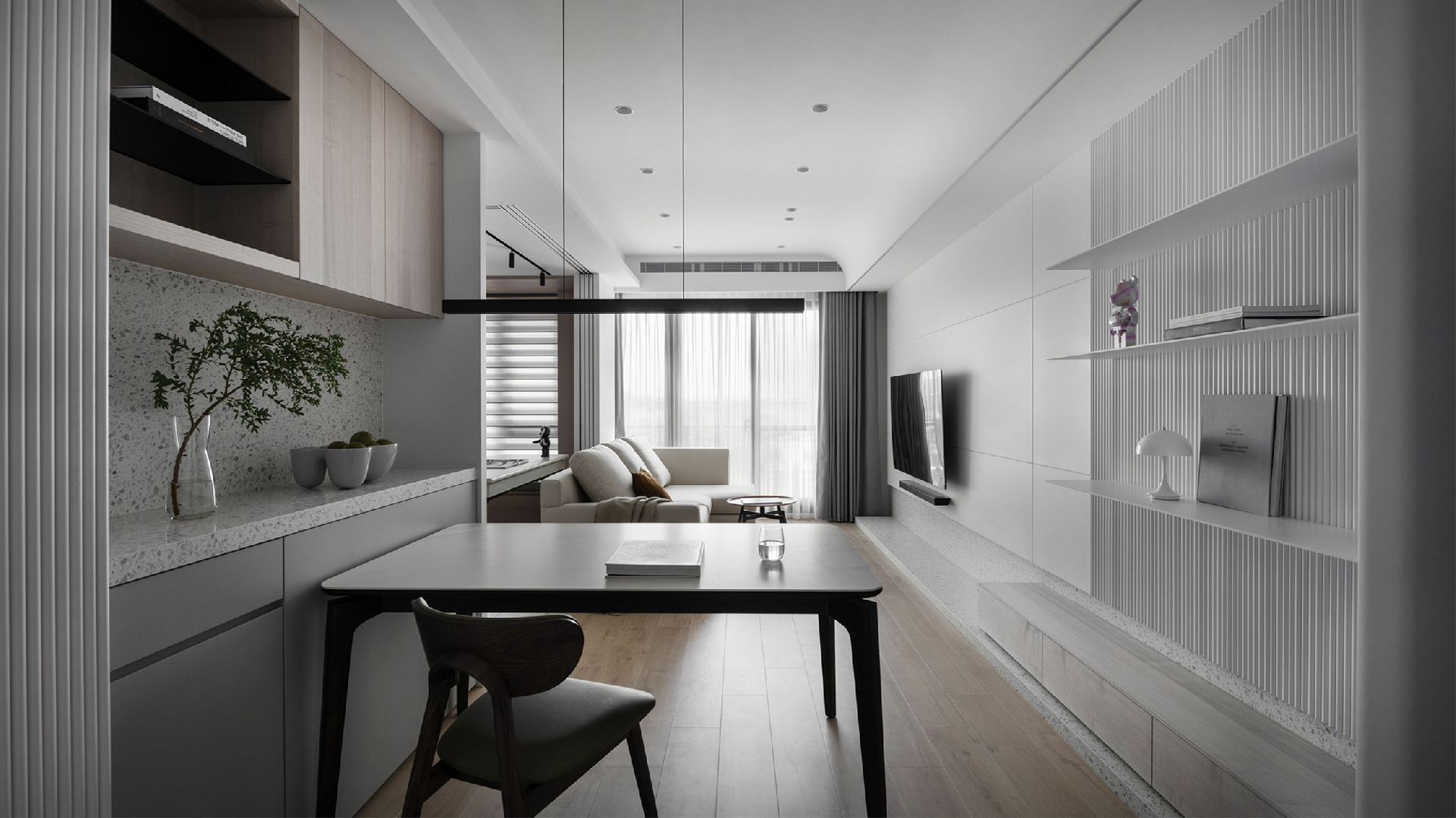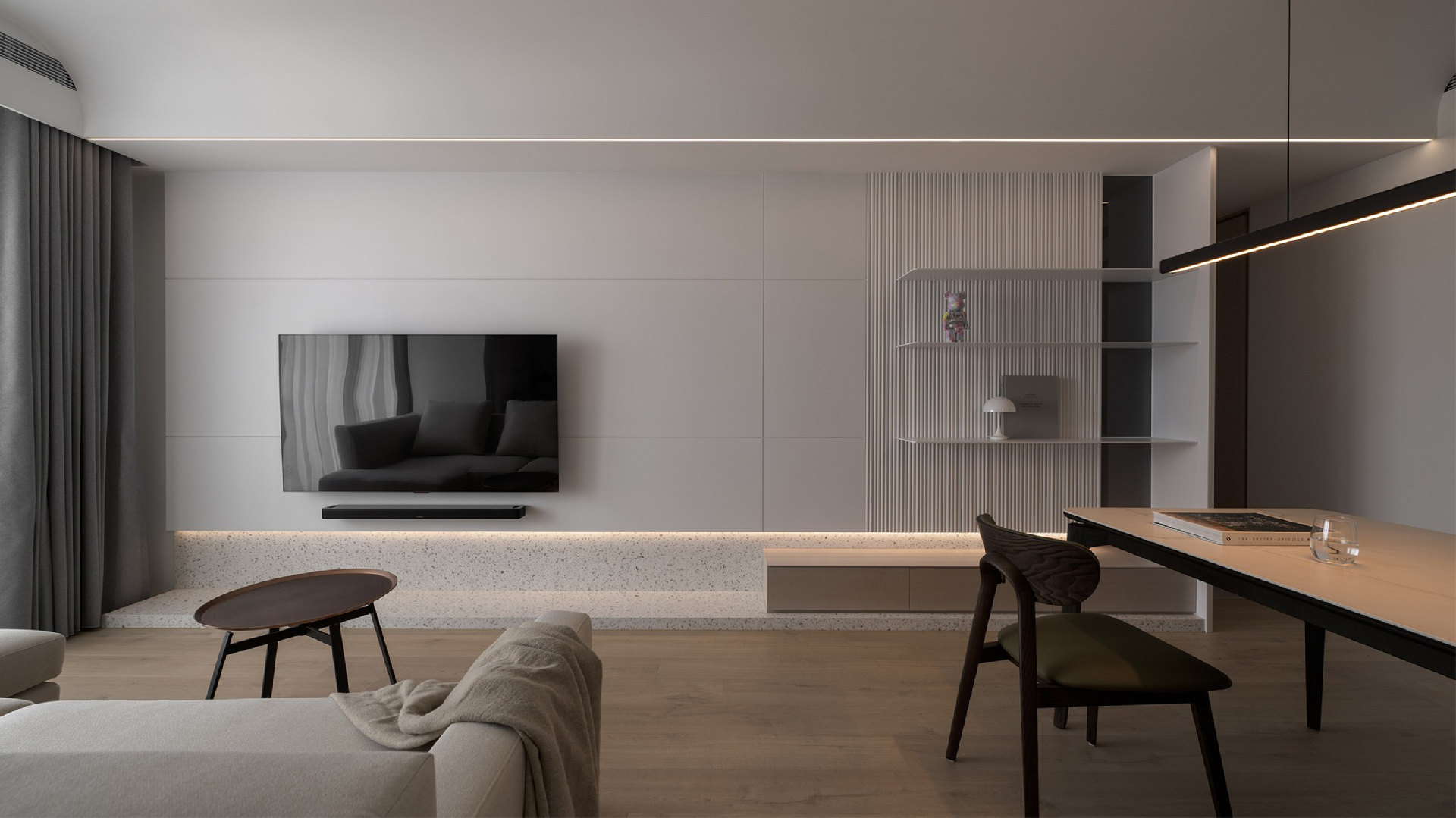 整個空間沒有過于紛擾的色彩,以白灰為基調,在利落的線條之下,現(xiàn)代簡約打造出最純粹、最干凈、最愜意的生活方式。背景采用干凈肅然的雅白提亮空間色彩,地臺加入一道淺色大理石橫向造型,讓空間顯得更加簡雅大氣,內嵌的隱形燈帶,透露著現(xiàn)代時尚經典的氣質,蘊藏著低調內斂的高級感。電視墻一側延伸的置物架,在格柵背景的點綴之下,可以放置簡約的擺件,用來活躍空間感。