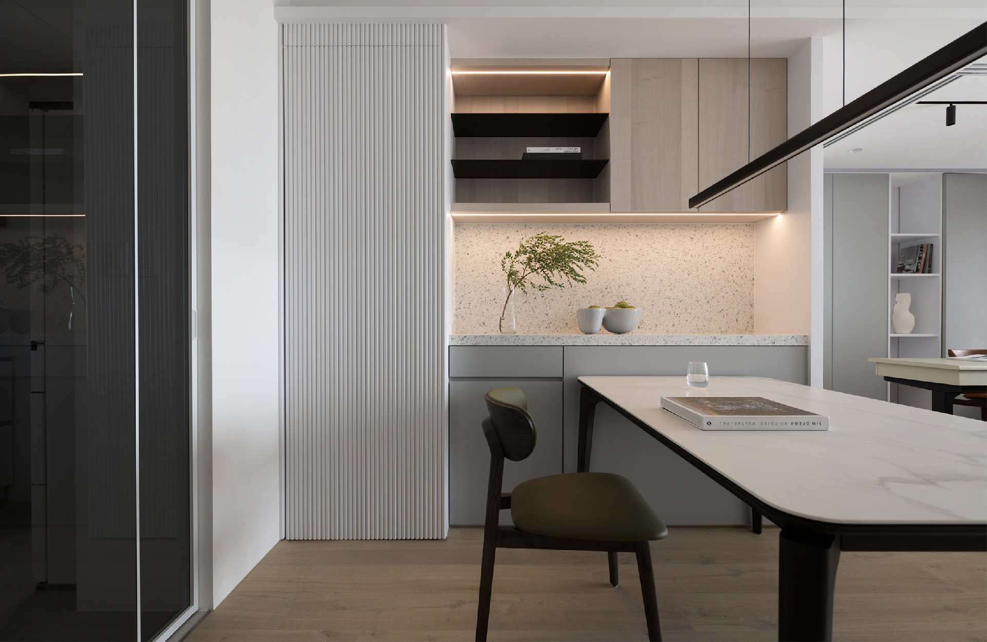 進門玄關柜做包圍設計,玄關處通透的造型組合,讓玄關增加了幾分靈動。懸空的鞋柜消減了柜體的厚重感,使得空間更為通透輕盈。柜體底部懸空部分設置隱藏光線,便于打掃和放置鞋子??臻g走廊作為緩沖區(qū),一側的鏤空墻面將空間區(qū)域分離開來,木飾面讓走廊空間也擁有儀式感,散發(fā)出的安謐之意平撫著居住者的心靈。客廳