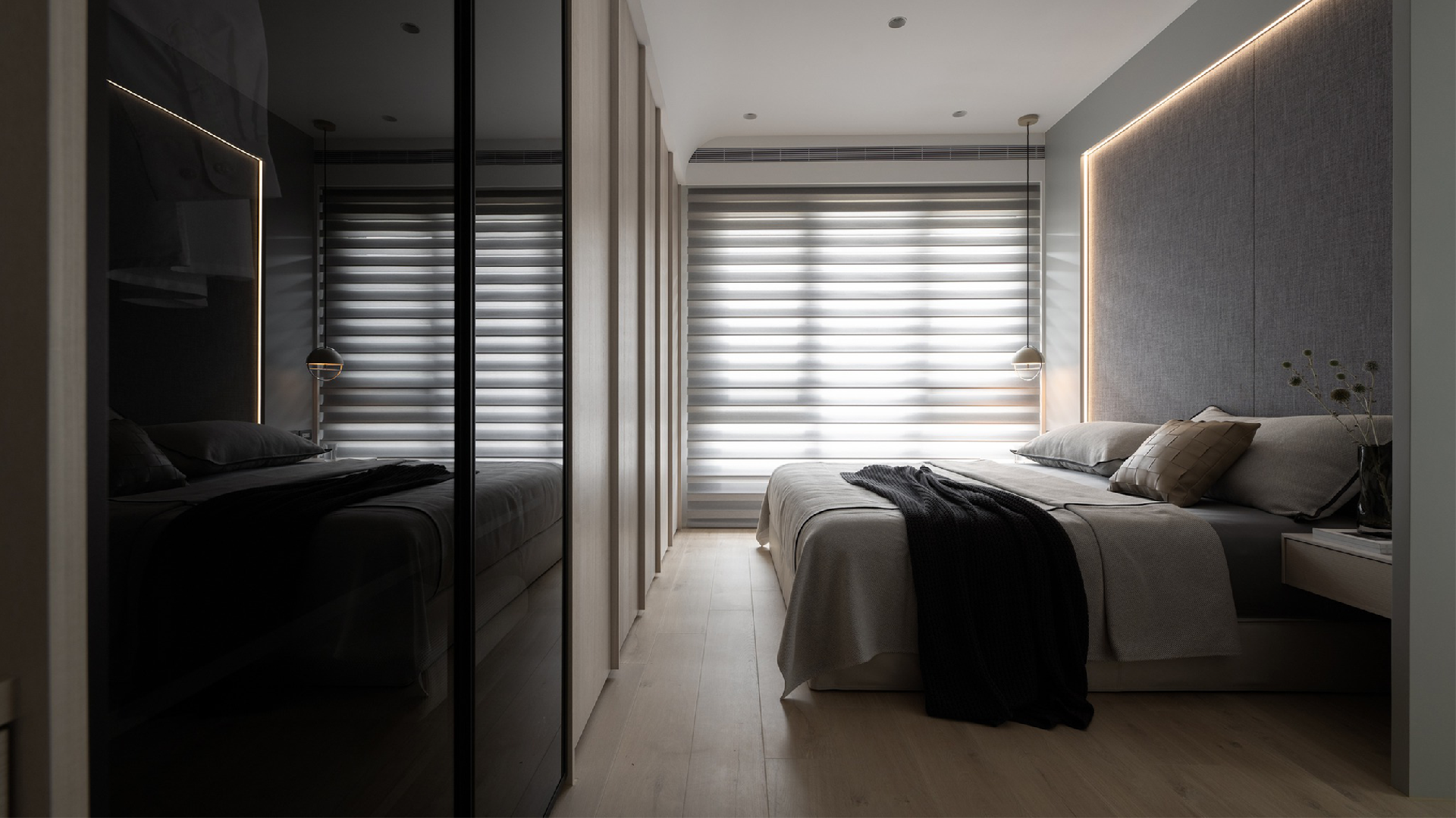 順著木地板進入主臥室,空間采用木色+灰色為主色調,恰如其分的冷靜和優(yōu)雅。床頭背景墻利用灰色硬包打理,與一側的淺灰色硬包相呼應。局部細密卻也格外吸睛,線性燈帶的增設為素雅的空間增添細節(jié)。窗戶采用百葉簾的設計,超大落地窗搭配百葉簾,節(jié)省空間又能打造出高級的光影效果。