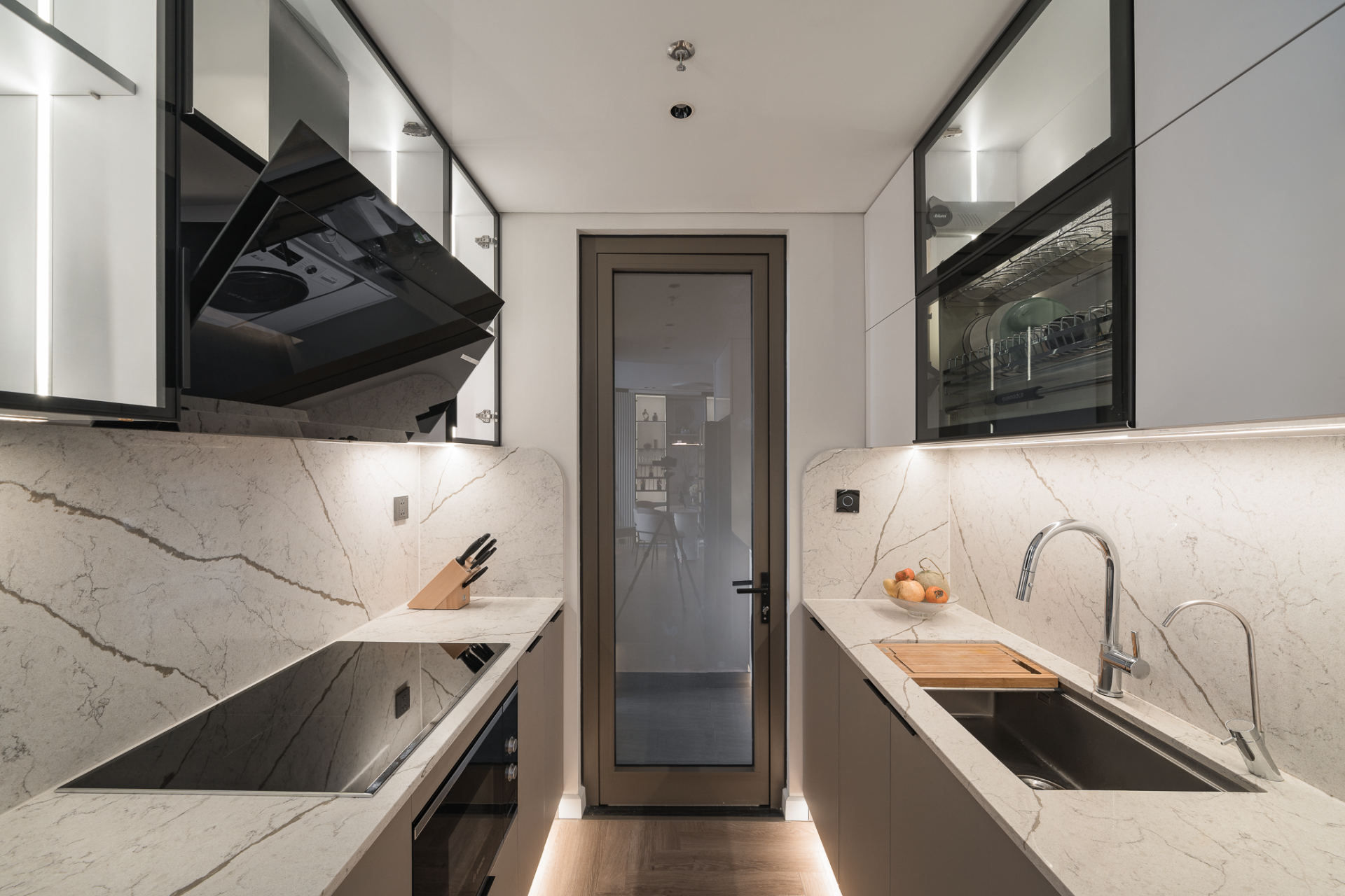 2、拆除廚房與餐廳之間的隔墻,增大廚房的使用面積,利用玻璃隔斷同時優(yōu)化采光。