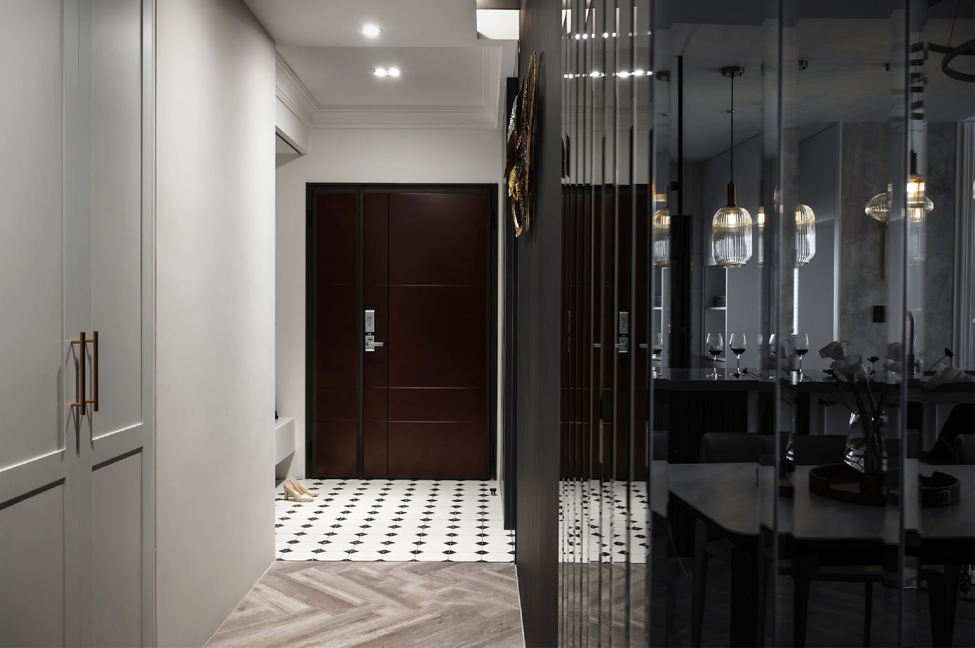 玄關(guān)處整體以簡(jiǎn)約為主基調(diào),布置大面積置物空間,打造“回家即解放”的輕松舒適感,站在玄關(guān),魚骨拼地板傾斜線條視覺上擴(kuò)大空間,放眼望去滿屋溫馨盡收眼底。