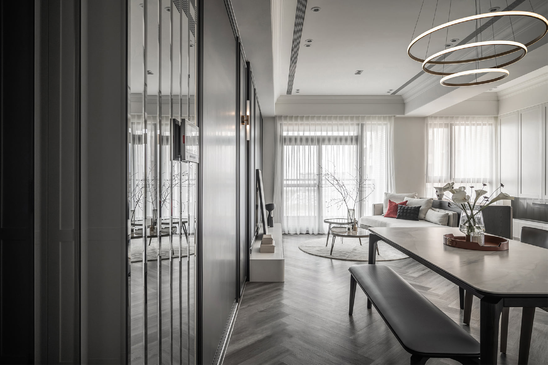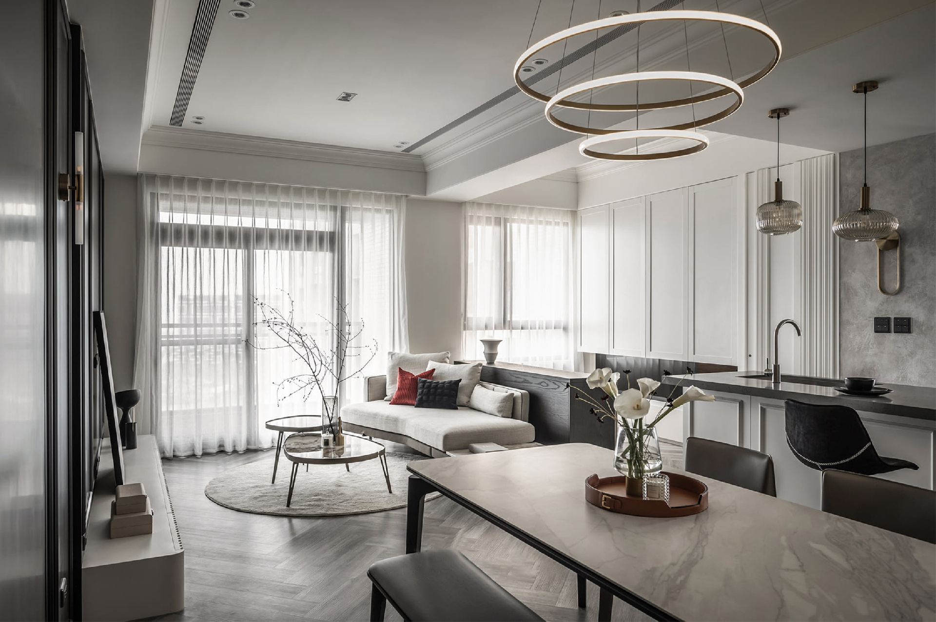 客餐廳一體設(shè)計(jì),大理石紋桌面搭配長(zhǎng)條凳與皮質(zhì)靠椅,輕奢圓環(huán)創(chuàng)意吊燈將燈光呈現(xiàn)遞進(jìn)式的鋪排,營(yíng)造抬頭見圓月的美感。