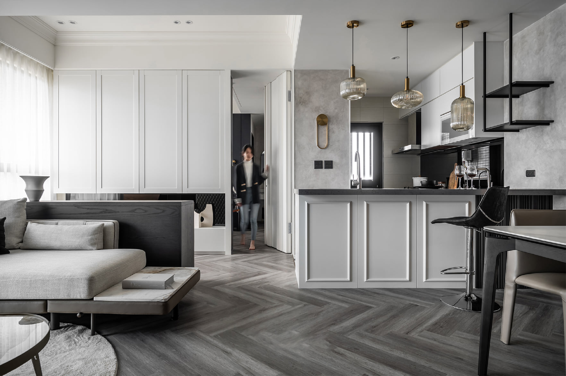 吧臺(tái)風(fēng)島臺(tái)設(shè)計(jì)的L形開放式廚房做留白處理,經(jīng)典黑白風(fēng)搭配微水泥質(zhì)地墻面,混搭美學(xué)完美拿捏,三盞創(chuàng)意玻璃吊燈錯(cuò)落有致,精致而高級(jí)。