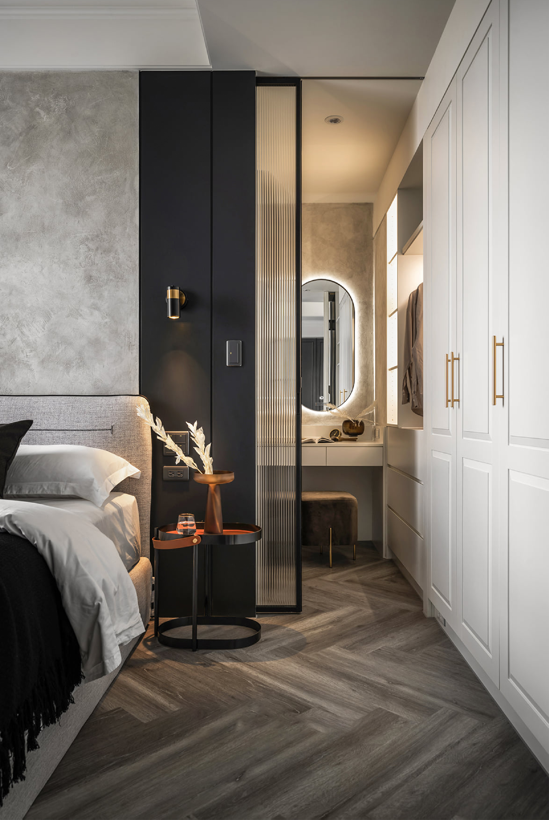 6. 長(zhǎng)虹玻璃門分隔臥室與衣帽間,氛圍感滿滿梳妝臺(tái)一定是女主人的秘密小天地